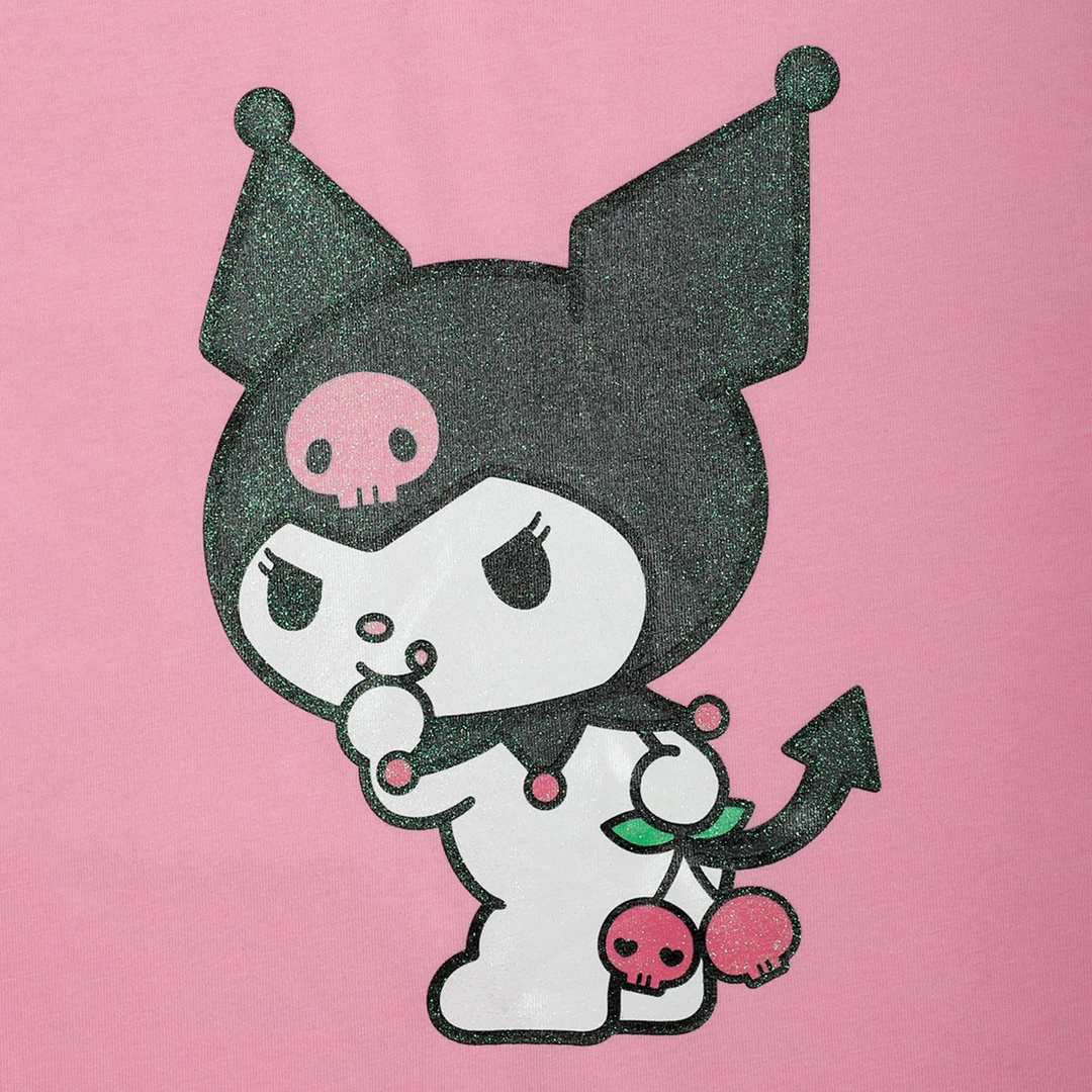 Oh, Kuromi! What are you up to now! Sparkle on with the glittery design printed on a simple pink tee.