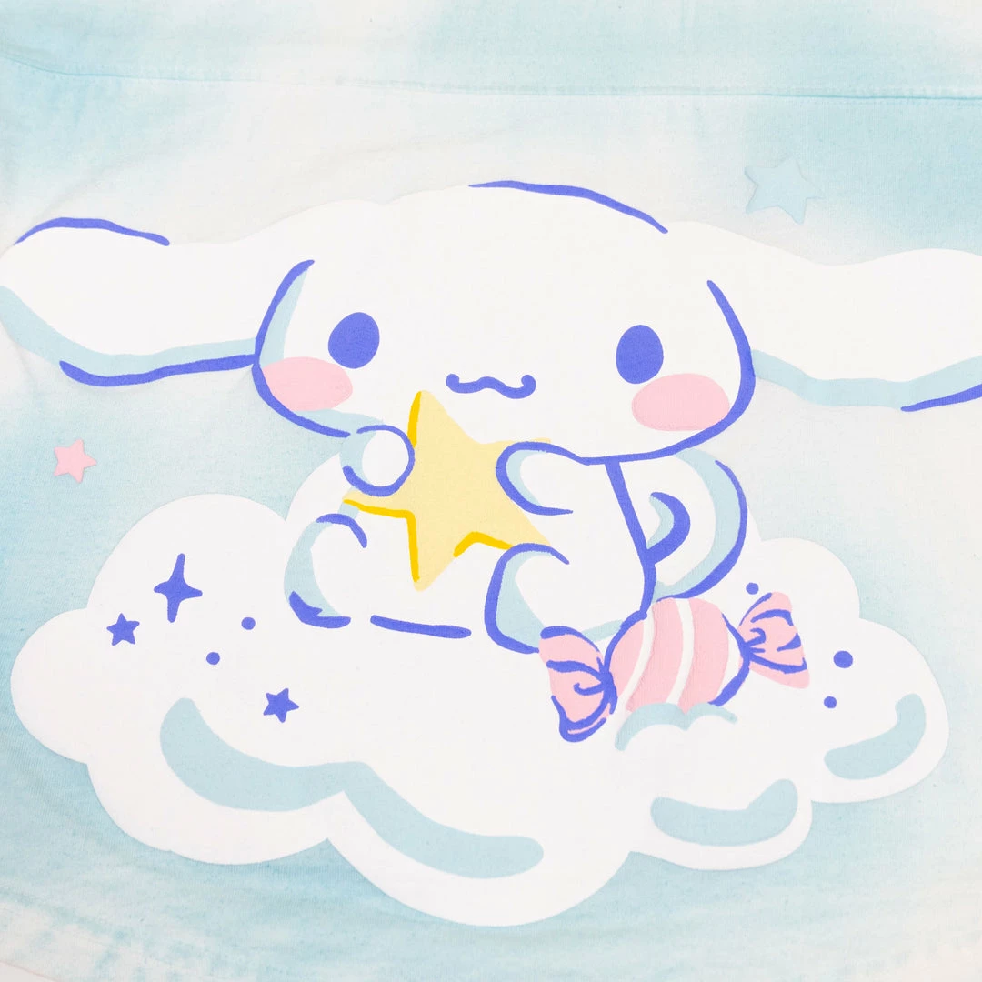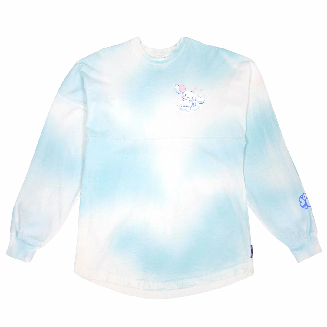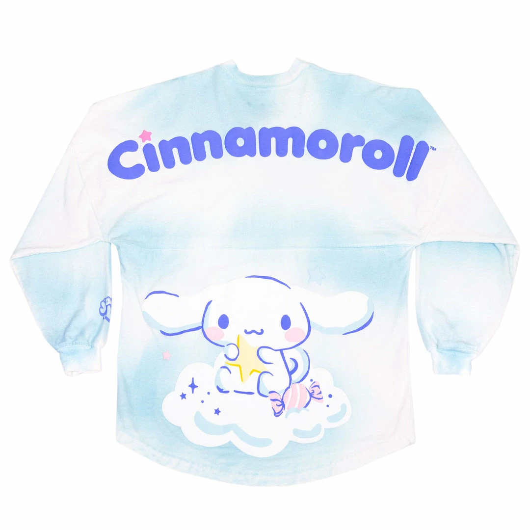 This Cinnamoroll JapanLA Spirit Jersey features a light blue and white cloud tie dye unisex Spirit Jersey top with puff printing of Cinnamoroll on the front. On the upper back, Cinnamoroll’s name is printed in periwinkle super puff! The lower back has a large graphic of Cinnamoroll sitting of a fluffy cloud holding a star. The JapanLA Logo is printed on the left sleeve.