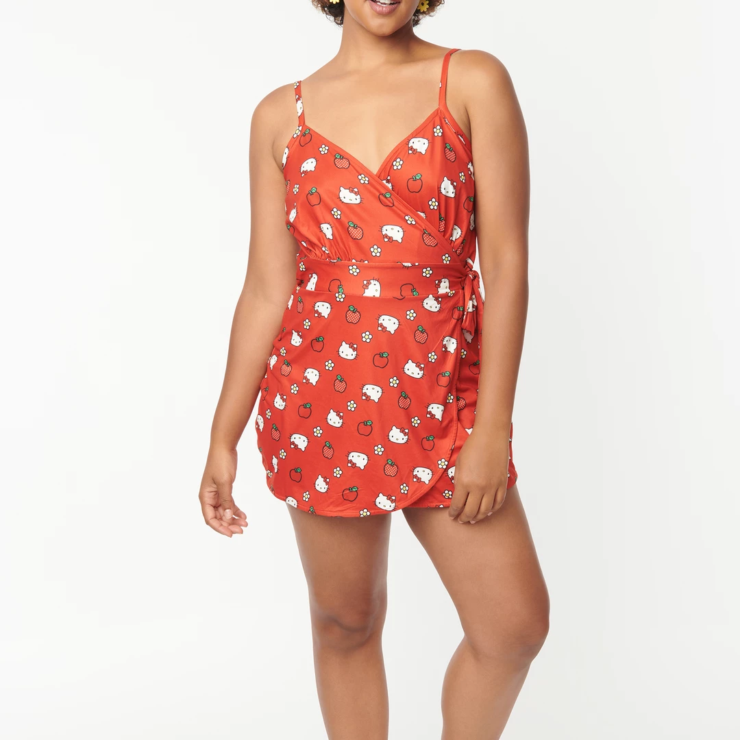 This adorable wrap dress is actually a romper! Crafted in a soft knit fabric, it features juicy red apples and apple blossoms along with Hello Kitty’s cute face on a scarlet backdrop. To create the wrap effect, it also has a ties at the side and an inner brief. It really is a one-and-done outfit for your next sunny weekend!