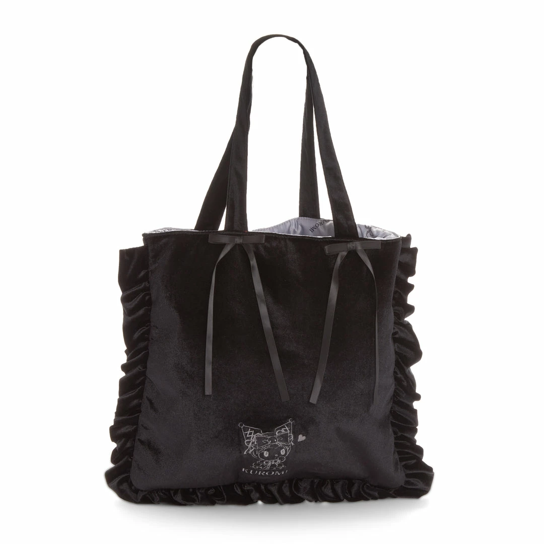 The statement piece of the MeloKuro series, this black velvet tote bag is trimmed with a ruffled edge and character embroidery at the bottom center. Finished with two black ribbons, an interior pocket, and patterned lining, it’s one of the loveliest totes we’ve seen yet.