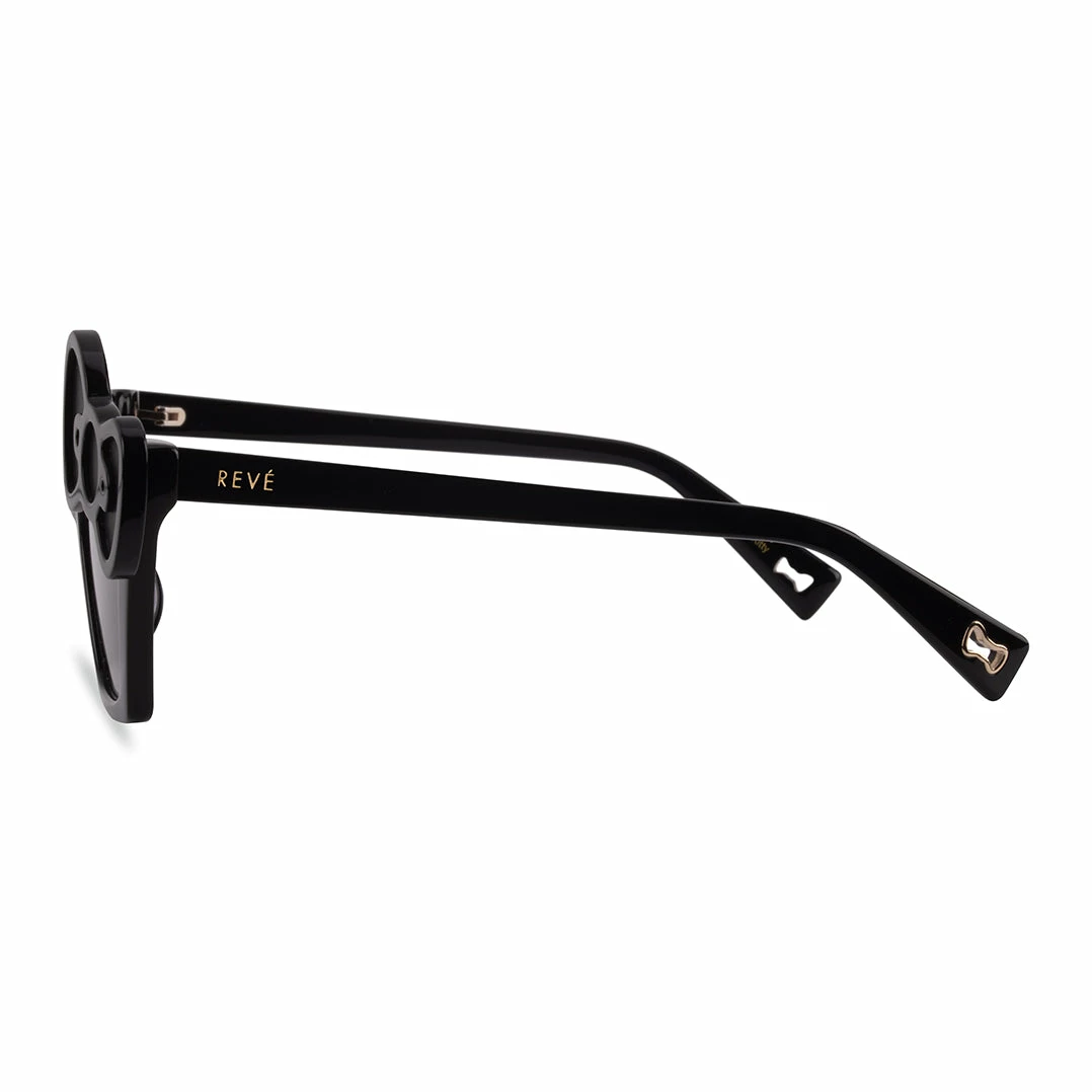 With a slick 80’s edge, Biu Biu makes a bold statement with an angled cat-eye silhouette. Hand polished with dark grey lenses and a high-contrast black acetate frame (accented with a removable, magnetic bow), consider this your new go-to pair for any and every sunny occasion. .
